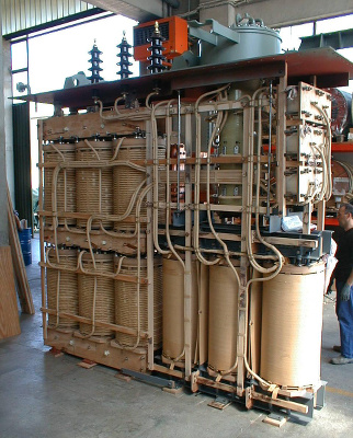 Krafttransformator för industriella applikationer med t.ex. höga sekundära strömmar (100 kA) och högt harmoniskt innehåll.